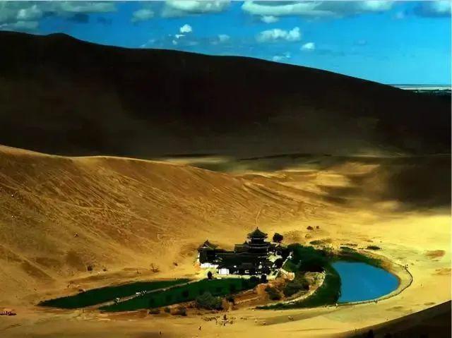 沙漠中低于潜水面的丘间洼地,经其四周沙丘渗流汇集而成的湖泊,如敦煌附近的月牙湖,四周被沙山环绕,水面酷似一弯新月,湖水清澈如翡翠。