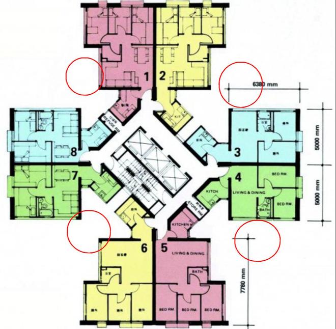 这些楼的基本架构是每个单元8户,核心筒构造,中间是3部电梯和防烟楼梯间,4个画圆圈处从下向上形成了凹槽结构,会有烟囱效应,火灾刚发生时的视频截图可以看到,火就是顺着这个凹槽向上蔓延的。